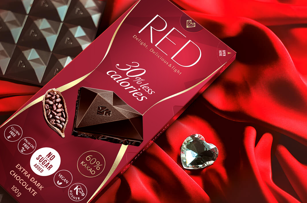RED Dark Chocolette is the first chocolate in the world containing up to 30% less calories of other Dark chocolates. RED was created using no added processed sugar which gives us our amazing taste with a reduced amount of fat.